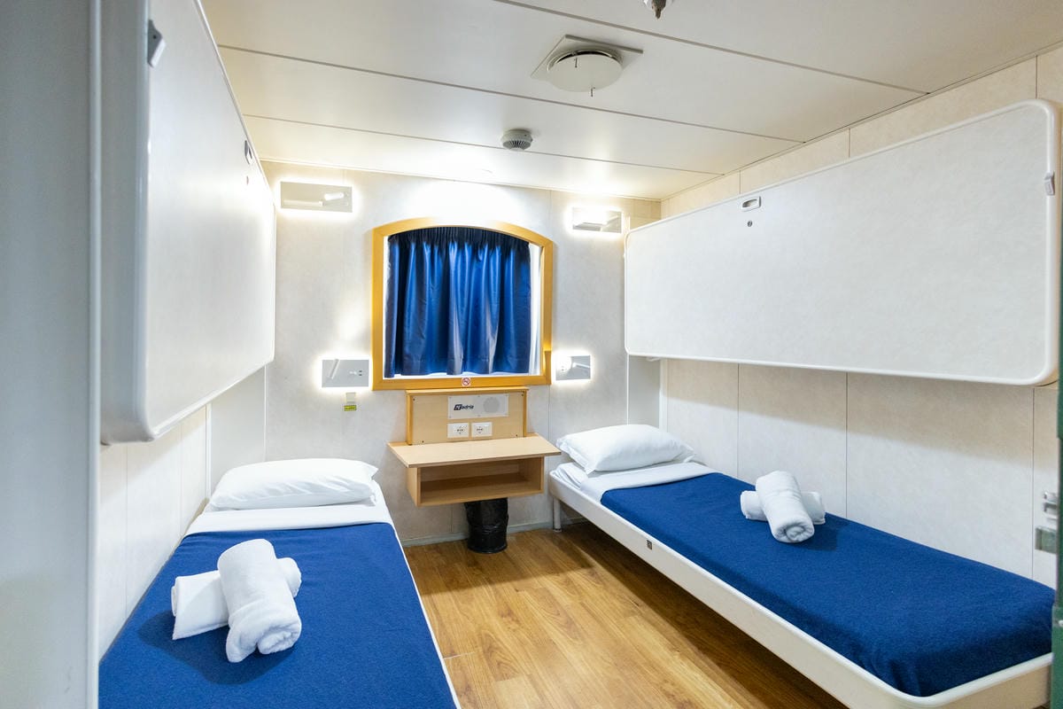 AF Mia is equipped with 197 cabins in total, all with toilet, shower and air conditioning. There are 2 cabins reserved for PMR passengers while on the upper decks there are 14 suites with double beds and triple or quadruple occupancy. Finally, there are 8 cabins reserved for travelers accompanied by pets. There are also 3 lounges on the ship that can accommodate up to 181 passengers.